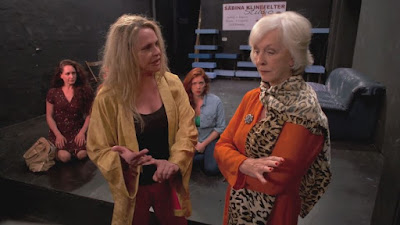 In "The Class," Biz insists on attending Wincy's acting class to see who he is training with. She is horrified to discover that the class is taught by crazy, eccentric Sabina Klinefelter (Priscilla Barnes), who is teaching her students acting techniques that would make even the Lee Strasberg cult from the Actors Studio roll their eyes. After witnessing Sabina's bizarre theories on acting, Biz confronts her and the two veteran actresses have it out with one another regarding their individual approaches to the craft. What I liked about the episode, besides the fact that it was incredibly honest and funny in its parody of the LA acting scene, was the fact that Watson plays fair with both Biz's and Sabina's perspectives and doesn't show favoritism with either. He allows both characters to represent the different kinds of actors, and acting styles, that make up the entertainment industry and lets them both have their say. Even though Biz is outraged at Sabina's teaching style, Sabina never comes across as a one-dimensional antagonist worthy of contempt. In her skillful hands, the underrated and fearless Barnes (who is also genuinely funny in her supporting role on the CW's critically acclaimed series "Jane the Virgin") allows the audience to recognize how Sabina is sincere about her teaching methods and that she genuinely believes her students have talent. The scenes depicting Sabina's acting class are indeed outrageous, but Barnes plays the scenes with a level of conviction and sincerity that allows the character to come across sympathetically. She is particularly terrific when Sabina is incensed at how Biz has criticized her students and her teaching methods. Barnes ensures that Sabina's not a contemptible charlatan out to scam her students.